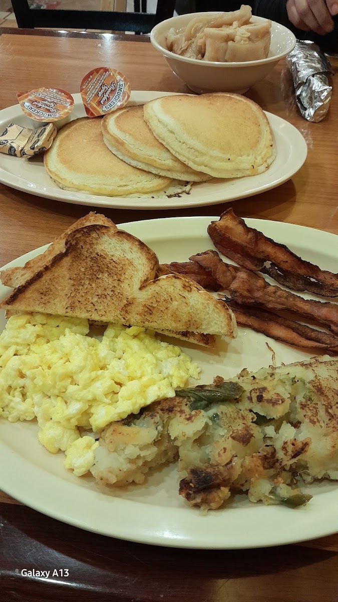 My wife and I have never been here and wanted somewhere near our tax guy. I chose this place and was pleasantly surprised. Parking was somewhat hard to find but 2 hours are free! Outside looks kind of rough but inside looks cozy and like a busy cafeteria. Once seated the service is excellent. I had pancakes and eggs, my lady had Menudo which was so tasty. Pancakes were so good and so were the potatoes. So much flavor. We highly recommend and there is a bakery right next door. They also serve beer!